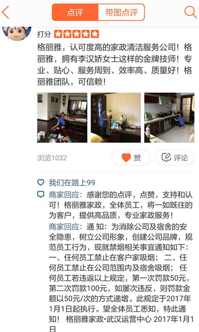 武漢格麗雅家政服務(wù)有限公司,始于2006年,是武漢市擁有家政服務(wù)注冊(cè)商標(biāo)的家政連鎖企業(yè)。武漢家政公司格麗雅現(xiàn)擁有一支具有豐富管理經(jīng)驗(yàn)的管理團(tuán)隊(duì),建立了一整套專(zhuān)業(yè)化的經(jīng)營(yíng)管理模式,推行ISO9000質(zhì)量管理體系和ISO140000環(huán)境管理體系:公司采用國(guó)際領(lǐng)先的員工制管理制度,穩(wěn)定了一批專(zhuān)業(yè)、素質(zhì)高、經(jīng)驗(yàn)豐富、團(tuán)結(jié)奮斗的員工隊(duì)伍;公司斥巨資研發(fā)了全套家政管理專(zhuān)用數(shù)據(jù)庫(kù),使員工客戶(hù)服務(wù)全部采用全程式一對(duì)一跟蹤微機(jī)管理服務(wù),同時(shí)引入OA…